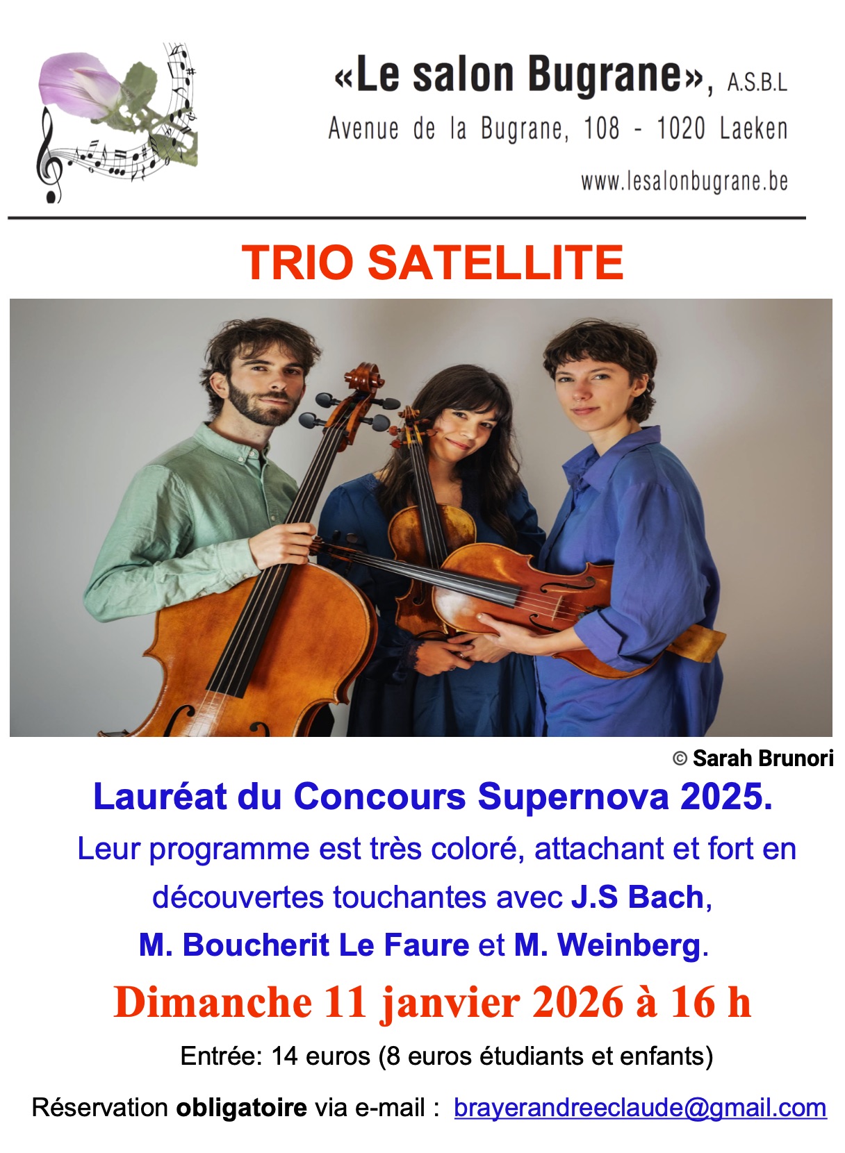 Pour ouvrir l’année 2026, le Salon Bugrane accueille le Trio Satellite, un jeune ensemble à cordes au tempérament lumineux. Lauréat du Concours Supernova 2025, ce superbe trio vous propose un programme très coloré, attachant et fort en découvertes touchantes …