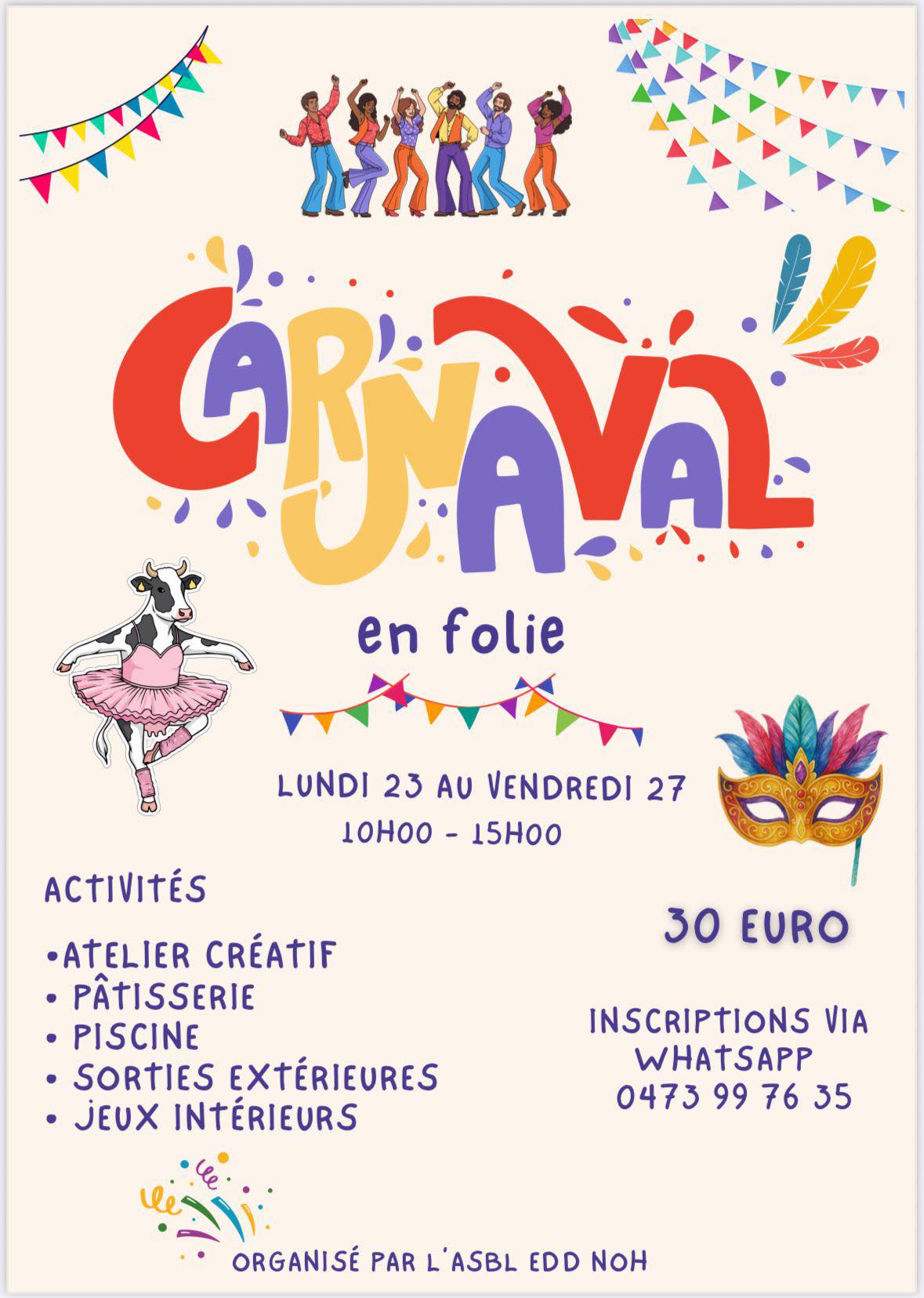 Nous organisons des activités de carnaval durant la deuxième semaine de congé, destinées aux enfants de 6 à 15 ans et plus.