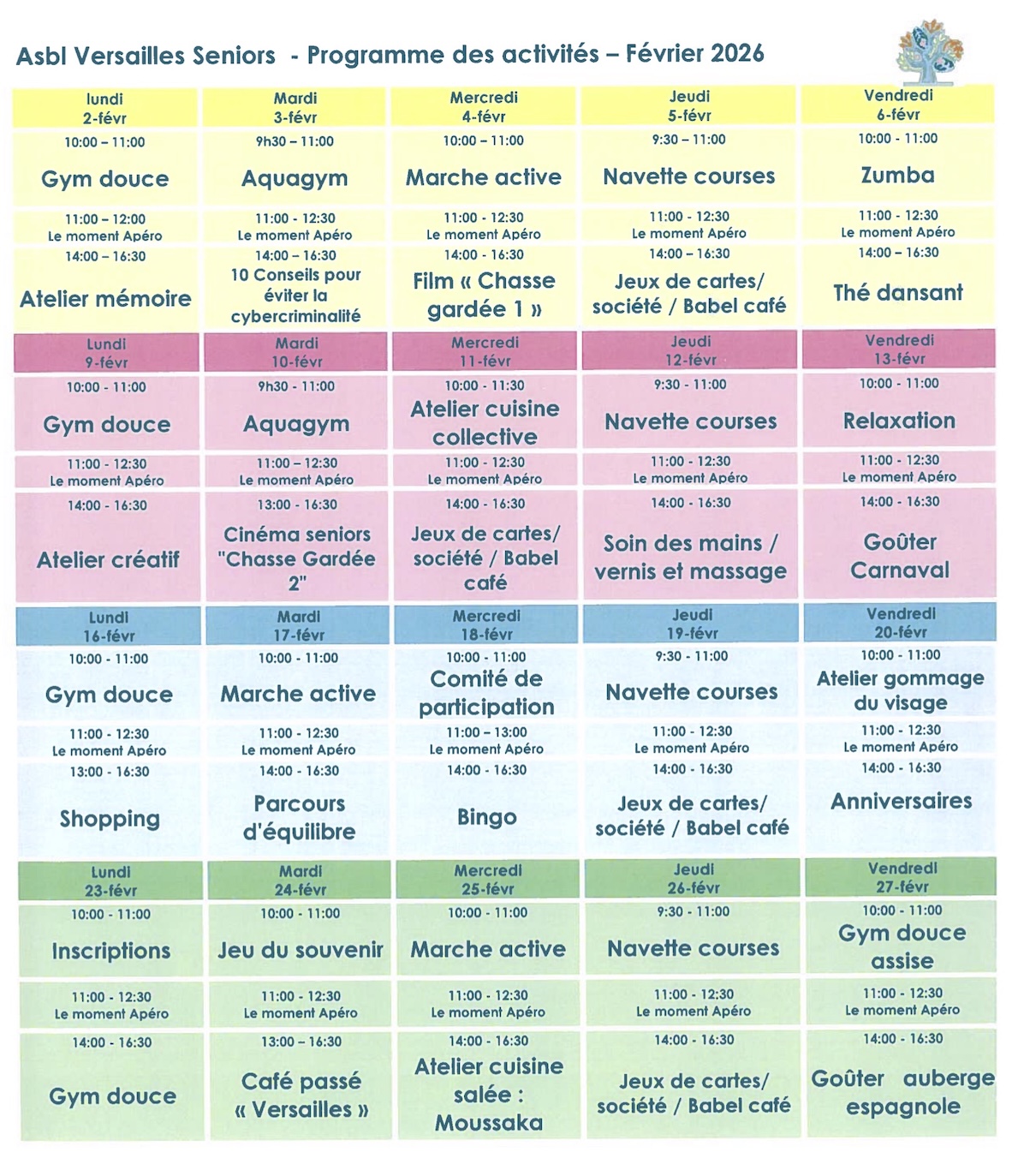 Programme d’activités de l’Asbl Versailles Seniors pour février 2026.