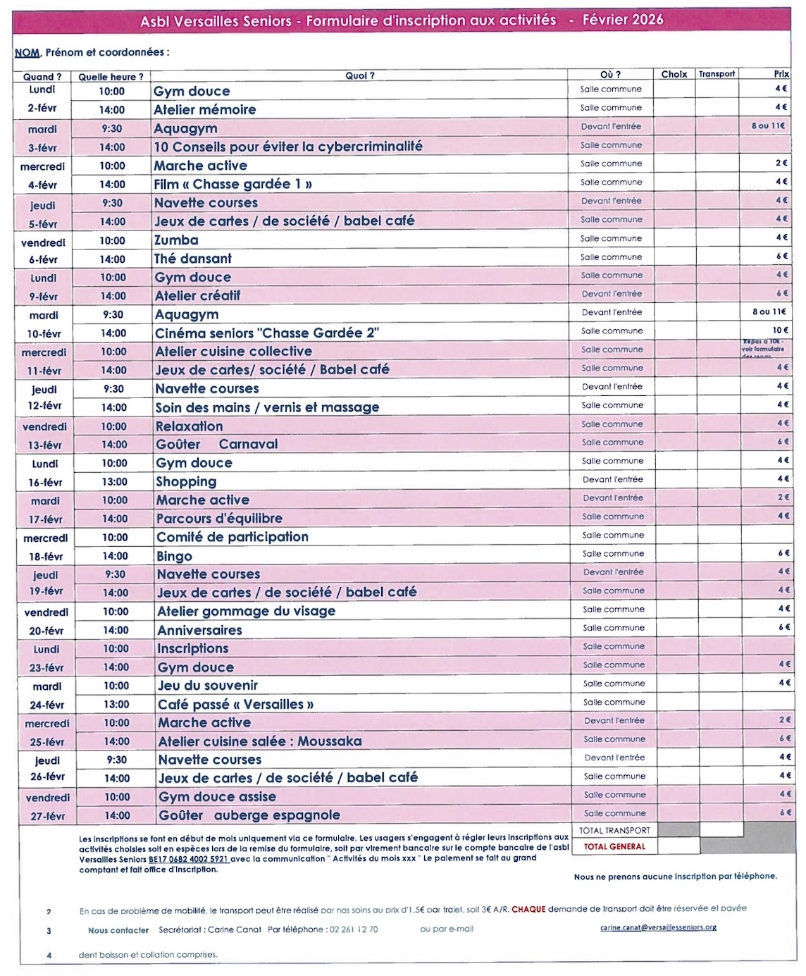 Merci de retourner le formulaire complété à madame Carine Canat, assistante de direction de l’Asbl, si vous souhaitez vous inscrire à certaines activités. Veuillez y préciser votre numéro de téléphone et votre adresse svp.